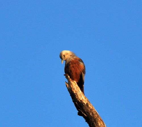 We were birding in Goa, when I saw a pair of chestnut tailed starling on a tree stump. This particular bird was looking down at the other, perched on a lower stump when I took the picture..loved its expression though.