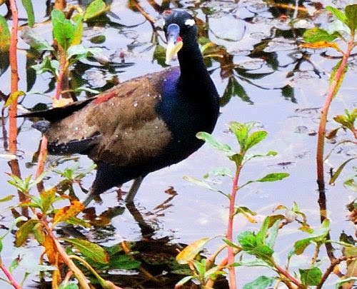 A teal was busy calling while a bronze winged jacana was looking for his chicks